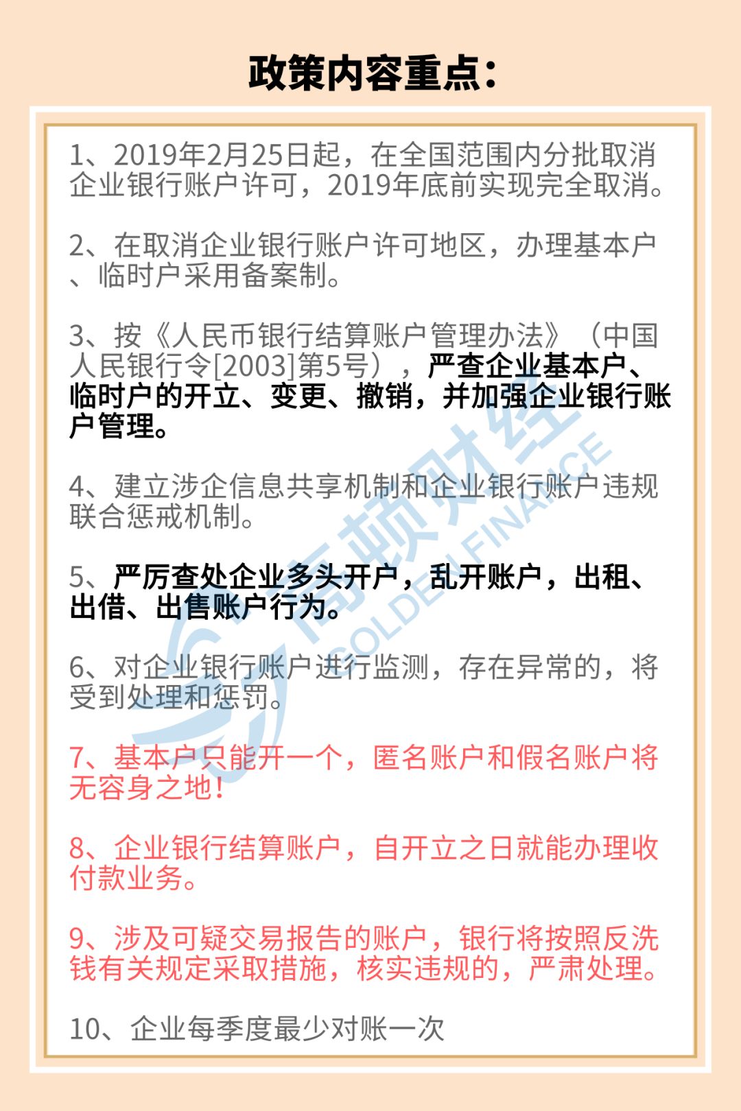 2月12日,在央行重磅发布的《关于取消企业银行账户许可的通知》(银发[2019]41号)政策中,非常明确:加强银行账户资金管控,取消开户许可证!2019年底前完全取消企业银行账户许可。为贯彻落实国务院常务会议决定,确保全国分批取消企业银行账户许可工作稳妥实施: